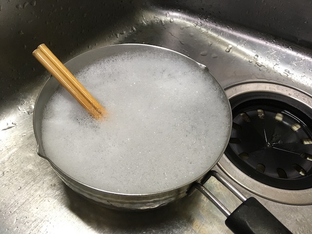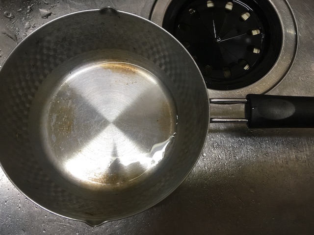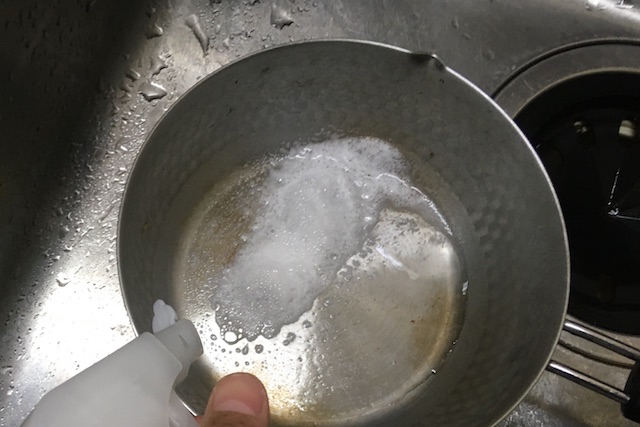 ↓鍋なんかはまず、汚れを水で軽く流しておきます。